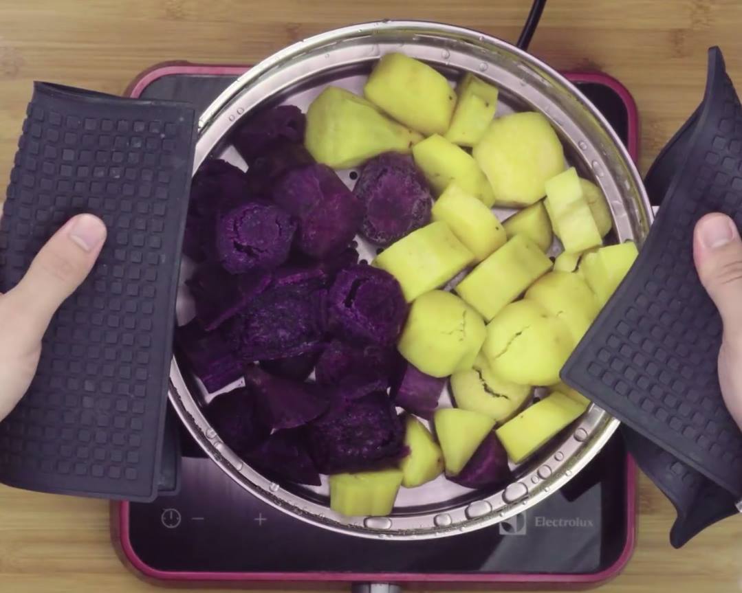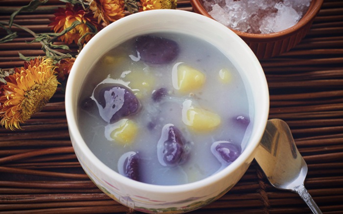 Chè khoai dẻo Đài Loan, một món ăn vô cùng hấp dẫn và cũng đang là món ăn được ưa chuộng của các bạn trẻ hiện nay. Bạn có lo lắng rằng trong những cốc chè bán ngoài thị trường sẽ ảnh hưởng không tốt đến sức khỏe nếu nó sử dụng đường hóa học và một số phụ gia, vậy tại sao không học cách nấu cho gia đình, bạn bè thưởng thức món chè tuyệt vời này bằng cách làm đơn giản dưới đây. Nguyên liệu làm chè khoai dẻo: - Khoai lang vàng: 150g - Khoai lang tím: 150g - Bột năng: 120g - Đường trắng: 80g - Nước cốt dừa - Vừng rang Nguyên liệu làm chè khoai dẻo Cách làm chè khoai dẻo: Bước 1: Tiến hành nạo bỏ vỏ khoai lang vàng và khoai lang tím, cắt bỏ 2 đầu của củ khoai để bớt sơ khi nhào bột. Sau đó rửa sạch và cắt khúc tầm 2 - 3 cm là được. - Đem hấp khoai cho chín. Đem khoai ra dùng thìa, dĩa nghiền nát và nhào với bột năng, cần nhào khi khoai còn nóng nên bạn có thể đến loại khoai nào thì mới lấy ra khỏi nồi hấp để đảm bảo khoai vẫn còn nóng. Khoai lang sau khi hấp xong (làm chè khoai dẻo) - Sử dụng một nửa số bột năng đã chuẩn bị từ trước để cho vào cùng khoai để nhào. Bạn tiến hành nhào bột đến khi nào bột mềm dẻo (như làm bánh bình thường vậy) thì được. Nếu trong quá trình nhào bột mà bị khô bạn có thể cho thêm nước để có bột khoai được dẻo nhất và ngon nhất khi làm chè. - Cách làm tương tự khi làm với khoai lang tím hoặc với khoai sọ nếu bạn muốn cho thêm. Bước 2: Sử dụng bột khoai vừa nhào vê thành cách viên nhỏ hoặc thành một dây dài và cắt khúc ra, hình thù tùy vào mong muốn của người làm. Chè khoai dẻo được nặn thành viên tròn Chè khoai dẻo được cắt thành khúc - Đem những miếng khoai vừa làm đi luộc, đến khi những miếng khoai nổi lên (tương tự như luộc bánh trôi), bạn vớt ra và cho vào một bát nước lạnh, để khoảng 5 phút rồi vớt ra. Bước 3: Bắt một nồi nước lên bếp, cho thêm đường (tùy vào khẩu vị người ăn có thể cho nhiều hoặc ít đường), thêm nước cốt dừa, đun sôi nhẹ rồi cho bột năng đã hòa tan vào nồi. - Tắt bếp, đổ chè khoai dẻo vào, để nồi chè sôi nhẹ sau đó tắt bếp và bắt nồi ra - Múc ra bát, chén. Thêm một chút vừng rang là bạn có thể thưởng thức món chè ngon tuyệt hảo do chính tay mình làm rồi đấy. Một ly chè khoai dẻo thơm ngon, hấp dẫn Cách làm rất đơn giản, hy vọng bạn có thể nhanh chóng cho bạn bè người thân của mình thưởng thức ly chè khoai dẻo do chính tay bạn làm nhé! Đọc thêm: >> Cách làm kẹo dẻo tại nhà >> Ba món canh chua giải nhiệt ngày hè