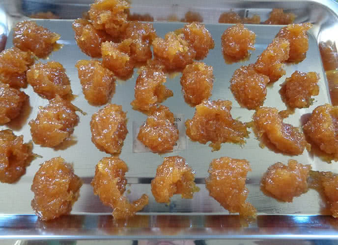 Kẹo dứa dẻo hay gọi là mứt dứa dẻo: Một món kẹo cực dễ làm, rất đẹp mắt. Bạn đã sẵn sàng cùng mình học cách làm món kẹo này để thưởng thức chưa ạ. Vị ngọt thanh cộng thêm chút vị chua sẽ giúp họng bạn được thư giãn nhiều đấy ạ. Cách làm kẹo dứa Nguyên liệu cần chuẩn bị - Dứa chín (không nên chọn quả chín quá, chín vừa tới là ngon nhất) - Đường xay - Đường trắng - Mật ong - Nước cốt chanh Cách làm kẹo dứa dẻo Dứa bạn đem gọt vỏ, cắt sạch mắt. Nếu muốn làm nhiều kẹo bạn có thể dùng nhiều hơn 1 quả theo ý mình nhé! Dứa đem gọt sạch vở và mắt Sau đó cắt dứa thành những miếng nhỏ, rồi băm nhỏ thịt dứa. Lấy đường trắng để ướp dứa trong vòng 15 phút, thường thì vì dứa có nước sẵn nên đường sẽ rất nhanh tan nên bạn có thể đem dứa đi sên luôn cũng được. Khi bắt đầu sên hãy cho vào dứa 1 thìa nước cốt chanh. Bắc chảo lên bếp và cho phần dứa đã ướp đường vào. Sên dứa thành đến khi đặc quánh lại Lúc đầu bạn có thể sên lửa to đến khi dứa với đường đã gần đặc lại hãy giảm nhiệt độ để không bị cháy nhé. Cho vào kẹo một thìa mật ong rồi đảo đều. Sau đó bạn cho thêm vào một thìa mạch nha để kẹo dễ cứng khi nguội. Dứa đã đạt độ dẻo vừa đủ Sau khi kẹo đã quánh dẻo vừa đủ, bạn bắt ra để cho bớt nóng thì tiến hành vo viên. Những viên kẹo nhỏ bằng ngón tay sẽ rất đẹp mắt sau khi làm xong. Tạo hình thành những viên kẹo nhỏ Chú ý: Bạn cần nhanh tay vê kẹo vì khi kẹo nguội hẳn sẽ cứng lại, lúc đó rất khó tạo hình viên kẹo. Thành phẩm kẹo dứa đẹp mắt Sau khi đã vê hết phần dứa đã làm, hãy cho đường xay vào một chiếc bát và thả những viên kẹo dứa vào, phủ đều đường xay phía bên ngoài kẹo để chúng không bị dính vào nhau. Cất vào lọ để thưởng thức dần món kẹo dứa này nhé. Chúc chị em thành công!!! Xem thêm: Cách làm kem túi hoa quả Cách làm chè bắp non Cách làm chè khoai dẻo Đài Loan