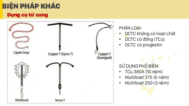 DỤNG CỤ TRÁNH THAI TRONG TỬ CUNG. (DCTC) các loại DCTC DCTC 1. Cơ chế tác dụng của DCTC : _ Ngăn chặn sự làm tổ của trứng trong tử cung. _Ngăn noãn thụ tinh với tinh trùng ( DCTC chứa nội tiết ) 2. Các thời điểm đặt dụng cụ tử cung. _ Về nguyên tắc có thể đặt bất kỳ ngày nào trong vòng kinh miễn là chắc chắn người đó không có thai. _Bất kỳ lúc nào trong vòng 12 ngày đầu của kỳ kinh. _ Ngay khi sạch kinh là tốt nhất vì lúc này chắc chắn không có thai, CTC còn hé mở, dễ đặt, ít đau. _ Sau sinh trên 4 tuần, tuy nhiên không nên đặt ở tuyến xã vì lúc này tử cung còn mềm dễ thủng. _ Sau phá thai : ngay sau pha thai nếu đảm bảo không sót nhau, sót thai và đường sinh dục không bi viêm nhiễm. _ Để tránh thai khẩn cấp ( DCTC có đồng ) : Đặt càng sớm càng tốt trong vòng 5 ngày đầu sau giao hợp không được bảo vệ, không được sử dụng khẩn cấp cho trường hợp hiếp dâm và có nguy cơ nhiễm khuẩn LTQĐTD cao. đặt DCTC II. CHỈ ĐỊNH VÀ CHỐNG CHỈ ĐỊNH : 1.Chỉ định : _ Phụ nữ trong độ tuổi sinh đẻ muốn áp dụng một BPTT tạm thời,dài hạn và không có chống chỉ định. _ Tránh thai khẩn cấp cấp ( DCTC chứa đồng ) 2. Chống chỉ định tuyệt đối: _ Có thai. _ Nhiễm khuẩn hậu sản, ngay sau sẩy thai nhiễm khuẩn. _ Ra máu âm đạo chưa rõ nguyên nhân. _ Bệnh nguyên bào nuôi ác tính có tình trạng bêta HCG vẫn gia tăng. _ Ung thư cổ tử cung, ung thư niêm mạc tử cung, đang bị ung thư vú ( chỉ đối với DCTC chứa nội tiết ), u xơ tử cung, dị dạng tử cung. _ Sa sinh dục độ II, độ III. _ Rong kinh, kinh nhiều, đau bụng kinh nặng. _ Đang viêm tiểu khung, viêm mủ cổ tử cung hay nhiễm Chalamydia, lậu cầu, lao vùng chậu. 3. Chống chỉ định tương đối : _ Bệnh nguyên bào nuôi ác tính có tình trạng bêta HCG giảm dần. _ Có nguy cơ bị nhiễm khuẩn LTQĐTD cao. _ Bệnh AIDS có tình trạng lâm sàng không ổn định. _ Người có tiền sử thai ngoài tử cung. _ Cơ địa dễ nhiễm khuẩn : bệnh tiểu đường giảm tiểu cầu, điều trị corticoid kéo dài. _ Ung thư buồng trứng , ung thư vú không có biểu hiện tái phát 5 năm ( chỉ đối với DCTC chứa nội tiết). _ Đang bị thuyên tắc mạch, thiếu máu cơ tim, chứng đau nửa đầu nặng, bệnh gan,.. ( chỉ đối với DCTC chứa nội tiết) Đặt DCTC Mutiload TCu375 III. THUẬN LỢI VÀ KHÔNG THUẬN LỢI : 1.Thuận lợi : _ Hiệu quả tránh thai cao 97-99%. _ Có tác dụng tránh thai nhiều năm. _ DCTC là phương pháp tránh thai rẻ tiền nhất. _ Không ảnh hưởng đến chức năng nội tiết, đến sự tiết sữa, dễ có thai trở lại sau khi tháo. _ Không ảnh hưởng đến những loại thuốc người phụ nữ dùng. 2. Không thuận lợi : _ Phải đến cơ sở y tế để đặt và tháo DCTC ra. _ Sau khi đặt DCTC thường có một số tác dụng phụ gây khó chịu ( đau nặng bụng, kinh nguyệt ra nhiều, kéo dài) _ Không có tác dụng phòng tránh các bệnh LTQĐTD. IV. LƯU Ý SAU ĐẶT DCTC : _ Nằm nghỉ tại chổ 30 phút, về nghỉ ngơi, làm việc nhẹ trong vài ba ngày, giữ vệ sinh, kiêng giao hợp một tuần. _ Lưu ý tác dụng phụ sau đặt DCTC trong vài ba ngày đầu, tình trạng kinh nguyệt bất thường trong 2-3 chu kỳ đầu. _ Đến kiểm tra lại sau 1 tháng, khám định kỳ hàng năm. _ Cần phải “ đi ngay “ đến cơ sở y tế kiểm tra khi : + Trễ kinh (nghi có thai) hay ra máu âm đạo bất thường. + Đau bụng dưới nhiều. + Khí hư hôi, biểu hiện tình trạng nhiễm khuẩn, sốt. + Kiểm tra không thấy dây DCTC hay thấy DCTC rơi ra ngoài… _ Nguồn : tài liệu TCYT Tây Ninh. _ Nguồn ảnh : internet.